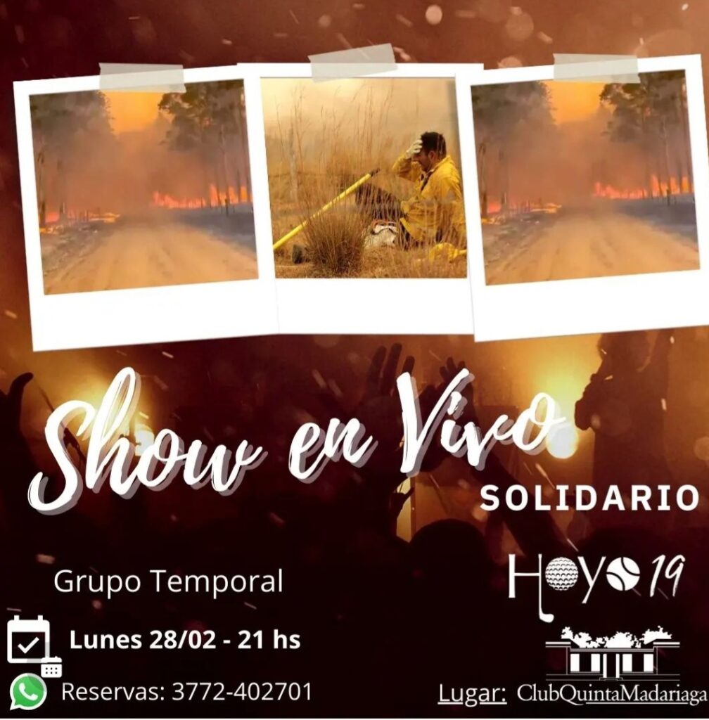 Este Lunes 28 de Febrero a partir de las 21hs habrá un show en vivo en Club Quinta Madariaga a beneficio de la catástrofre ambiental que está azotando a la provincia de Corrientes. Con la banda del Momento «Grupo Temporal» Vení a disfrutar de una noche de carnaval. ¡TE ESPERAMOS!